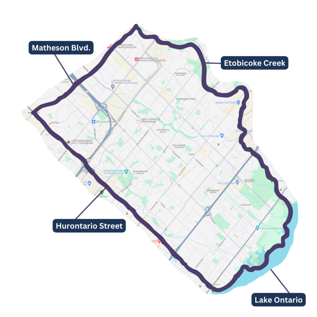Our East Mississauga catchment area falls within the borders of Matheson Blvd. to the north, Lake Ontario to the south, Hurontario to the west, and Etobicoke Creek to the east.